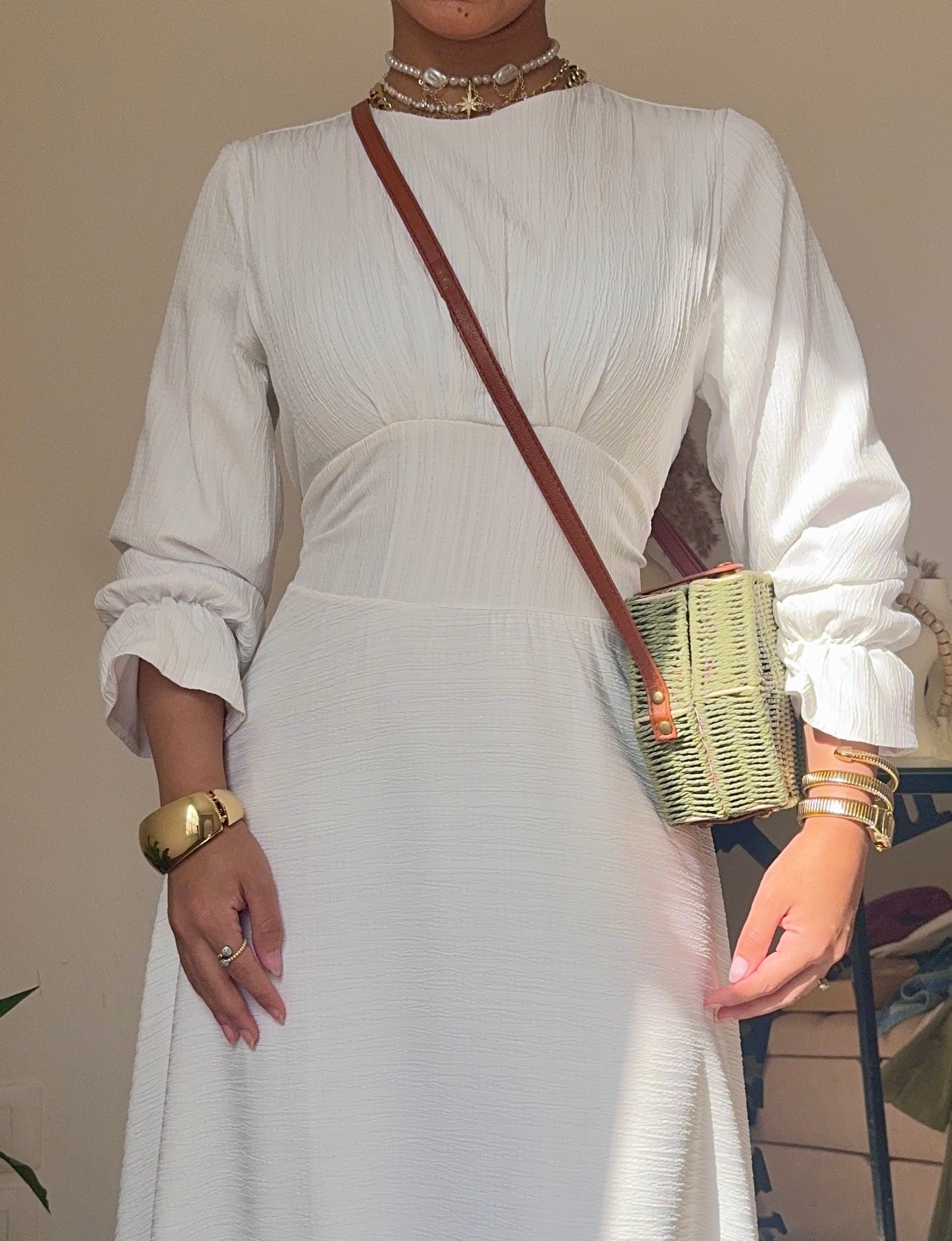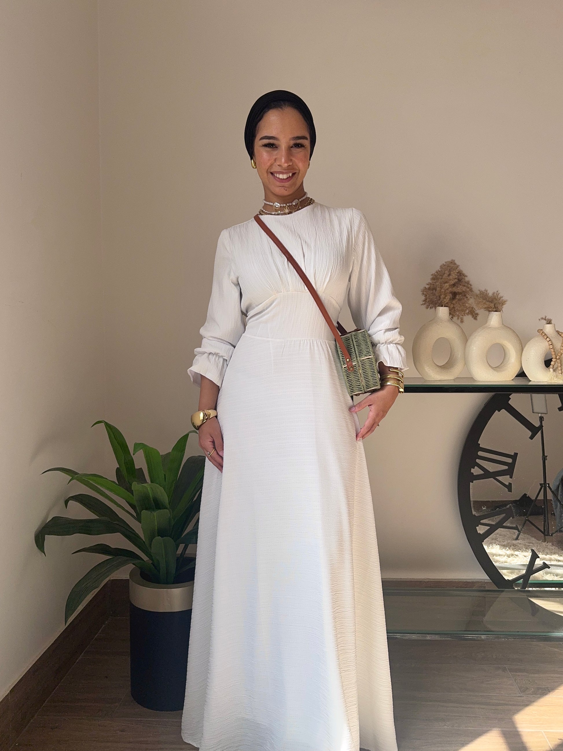 Simple yet chic, this flowy white dress features a lightweight fabric, flattering waistline, and balloon sleeves—perfect for sunny days and effortless style.